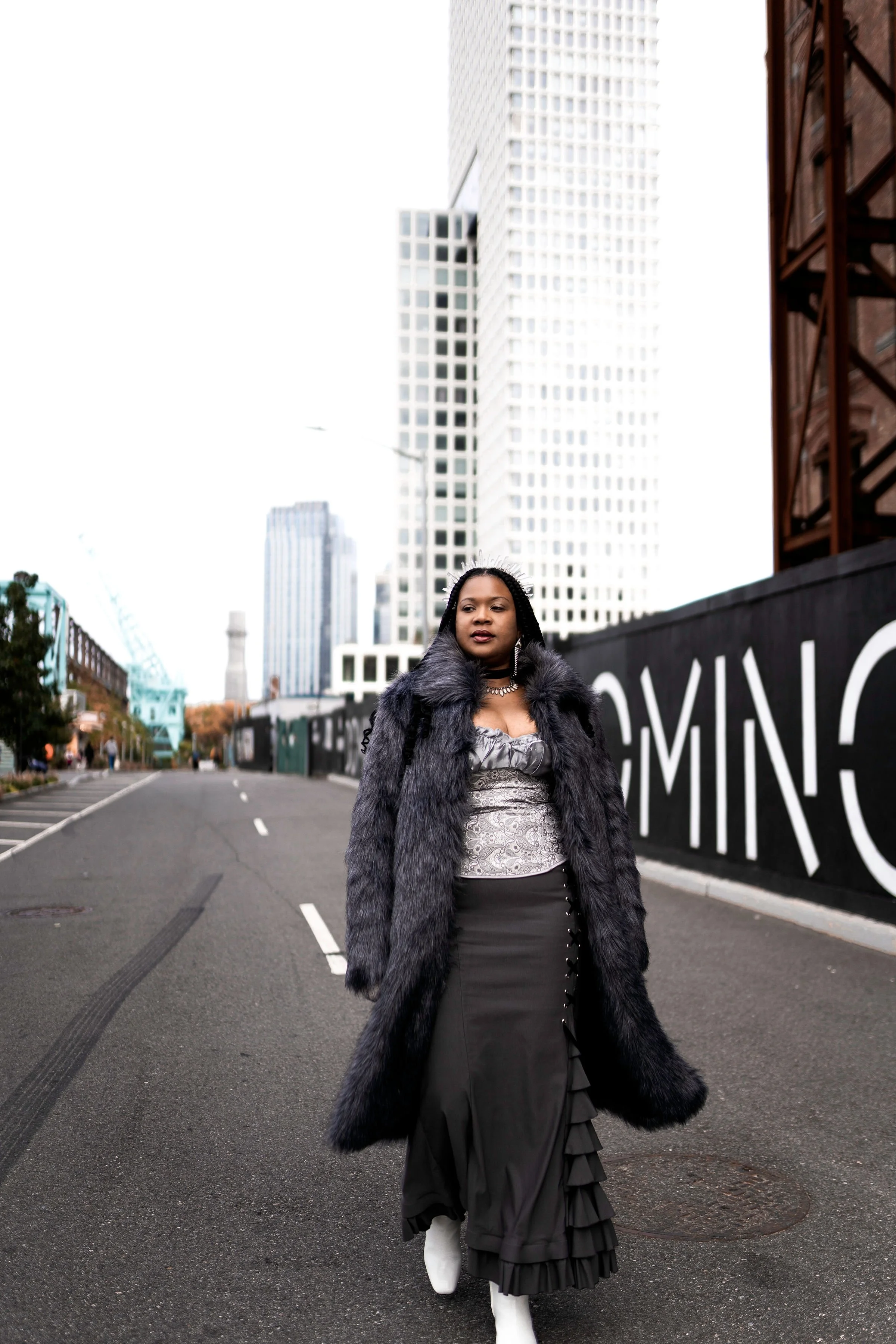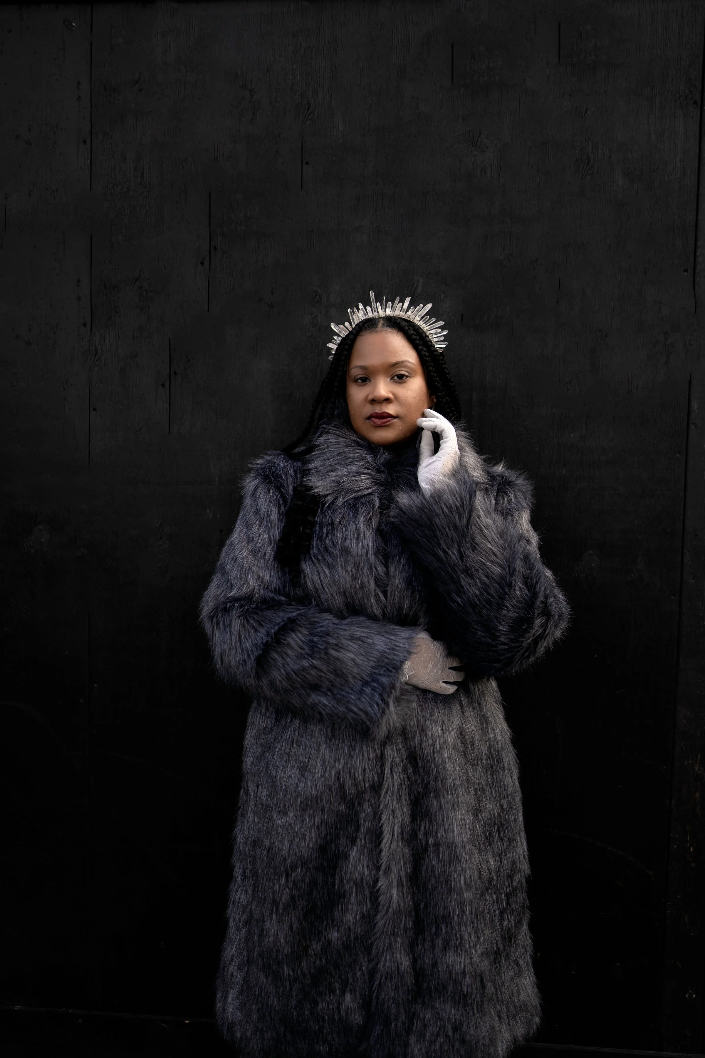 Coat, corset, skirt, crown, gloves: Amazon; shoes: INC; earrings: Aldo