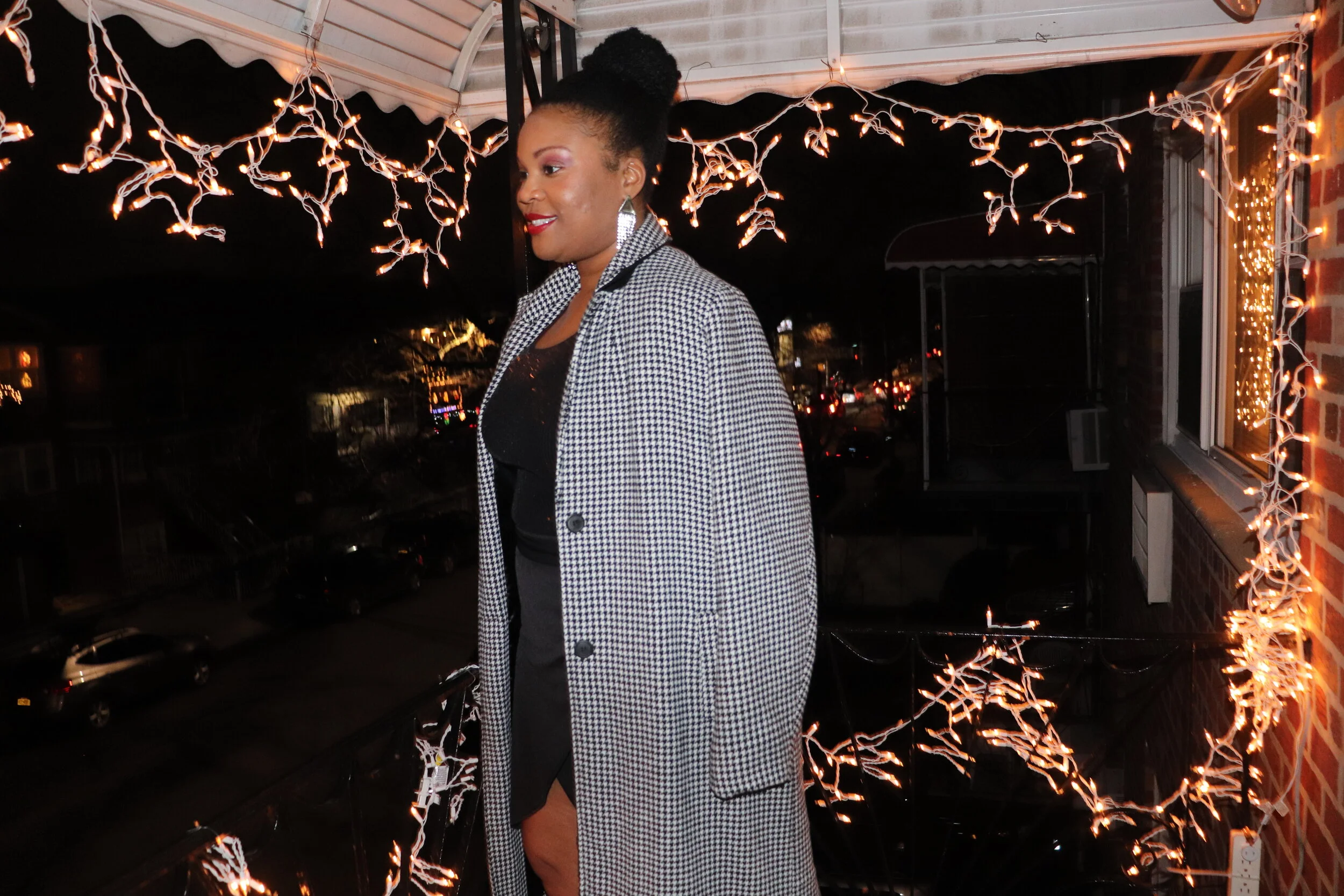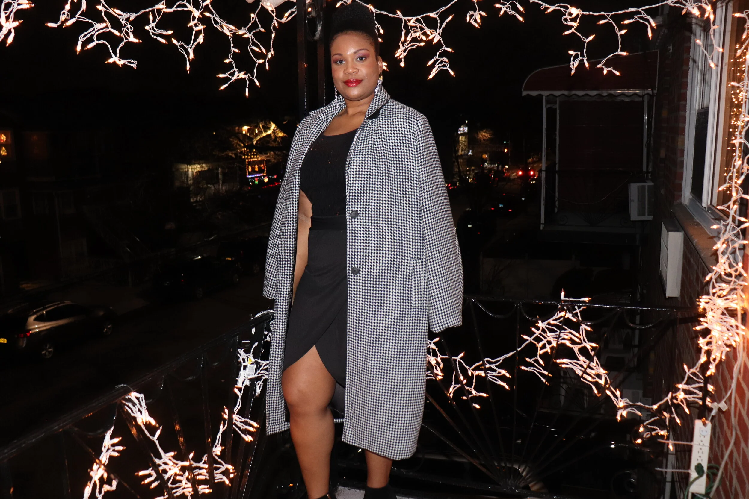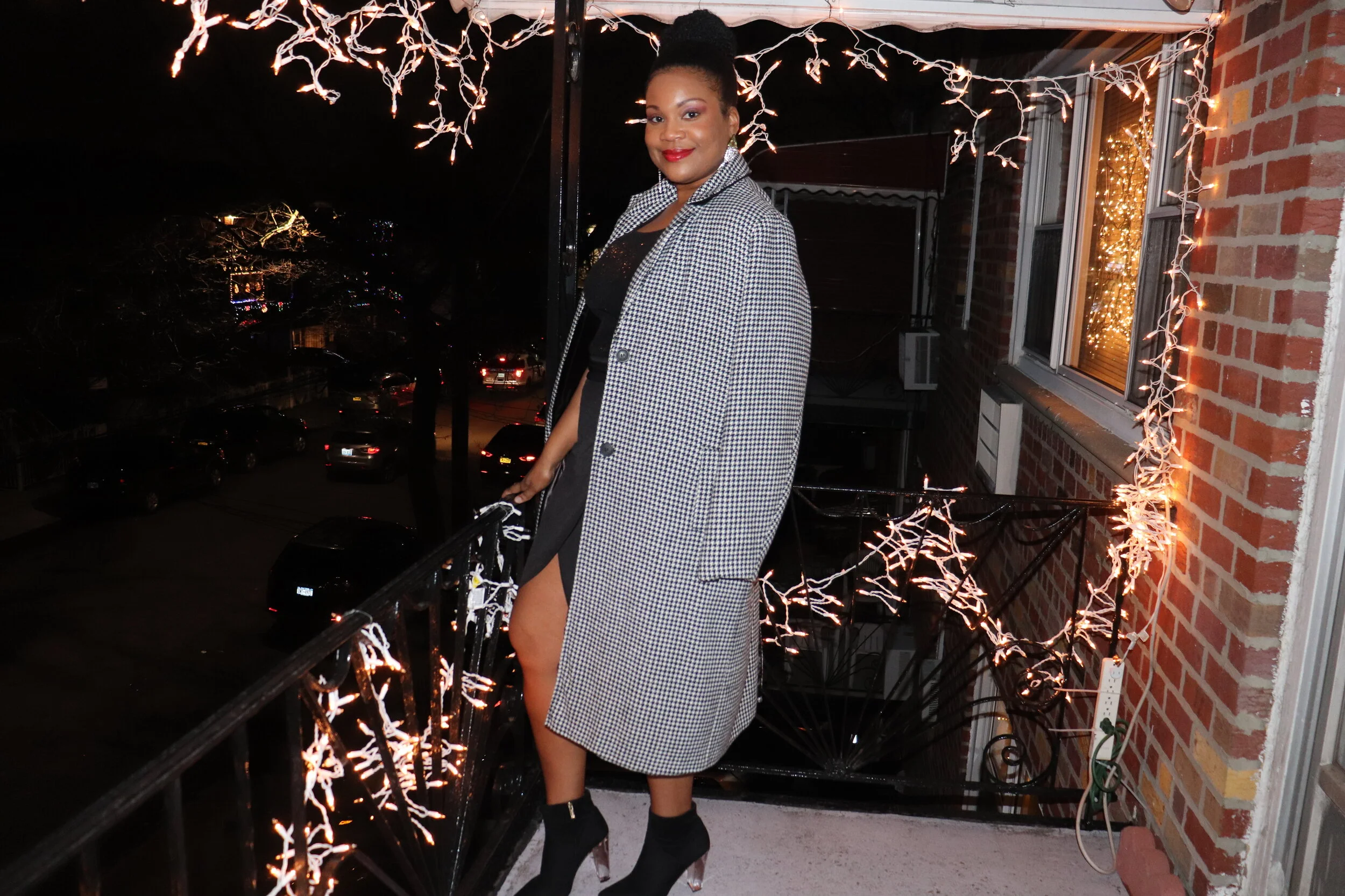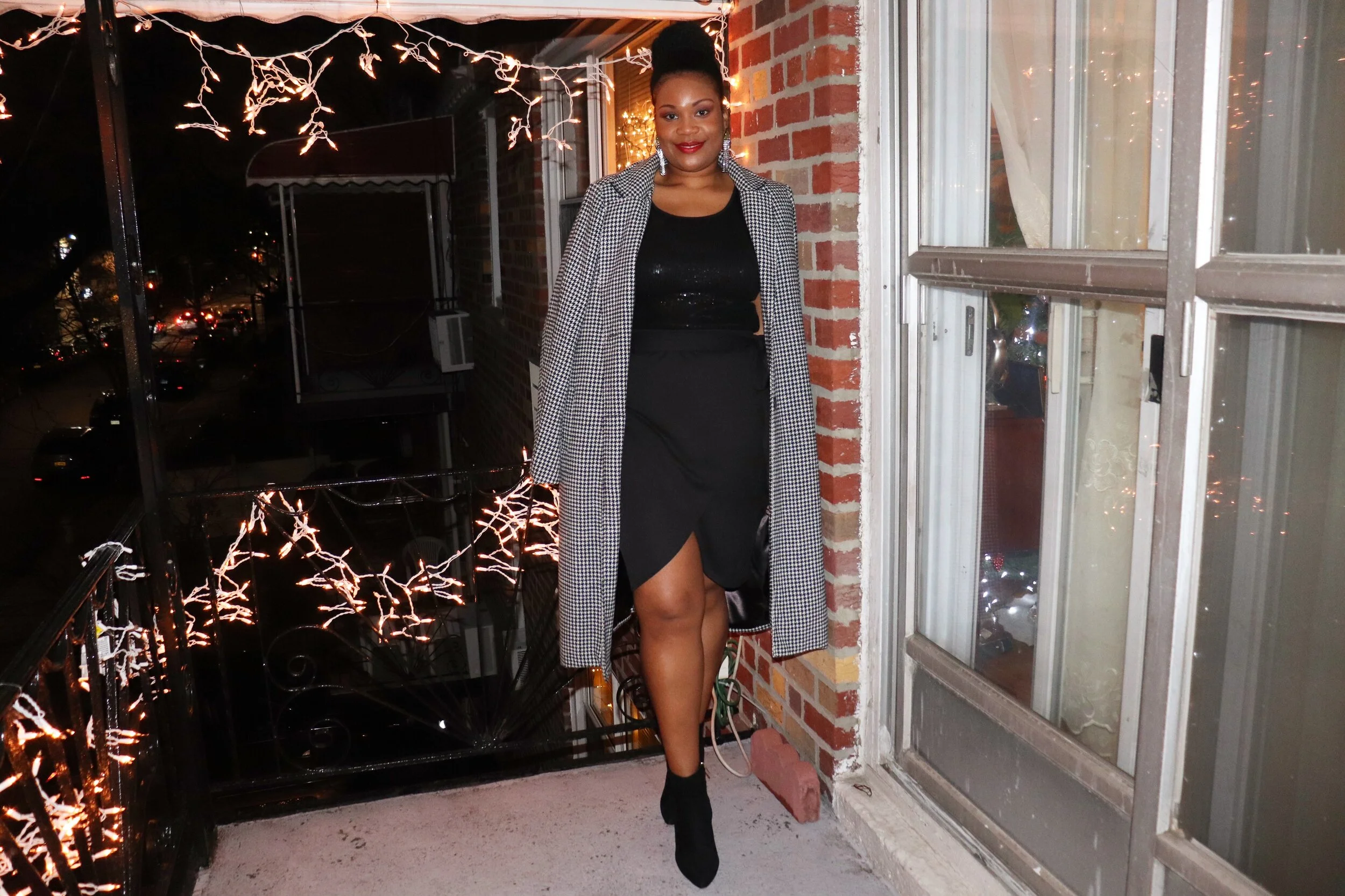 Outerwear: Nordstrom Rack; sequin blouse: Macy’s; mini wrap skirt: Boohoo; booties: Jessica Simpson; earrings: Aldo
