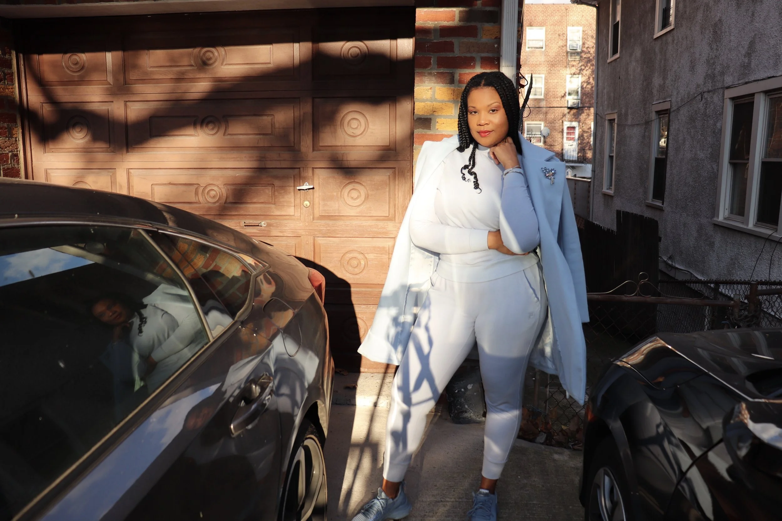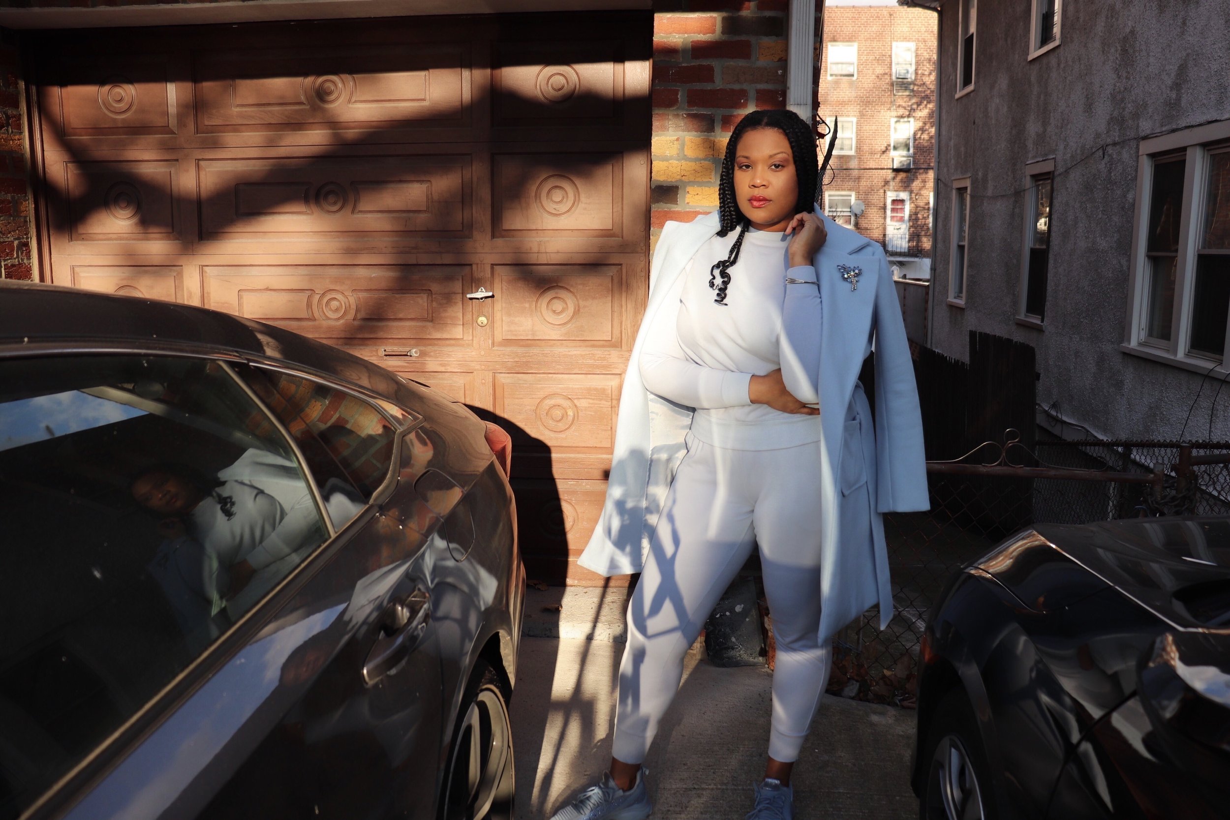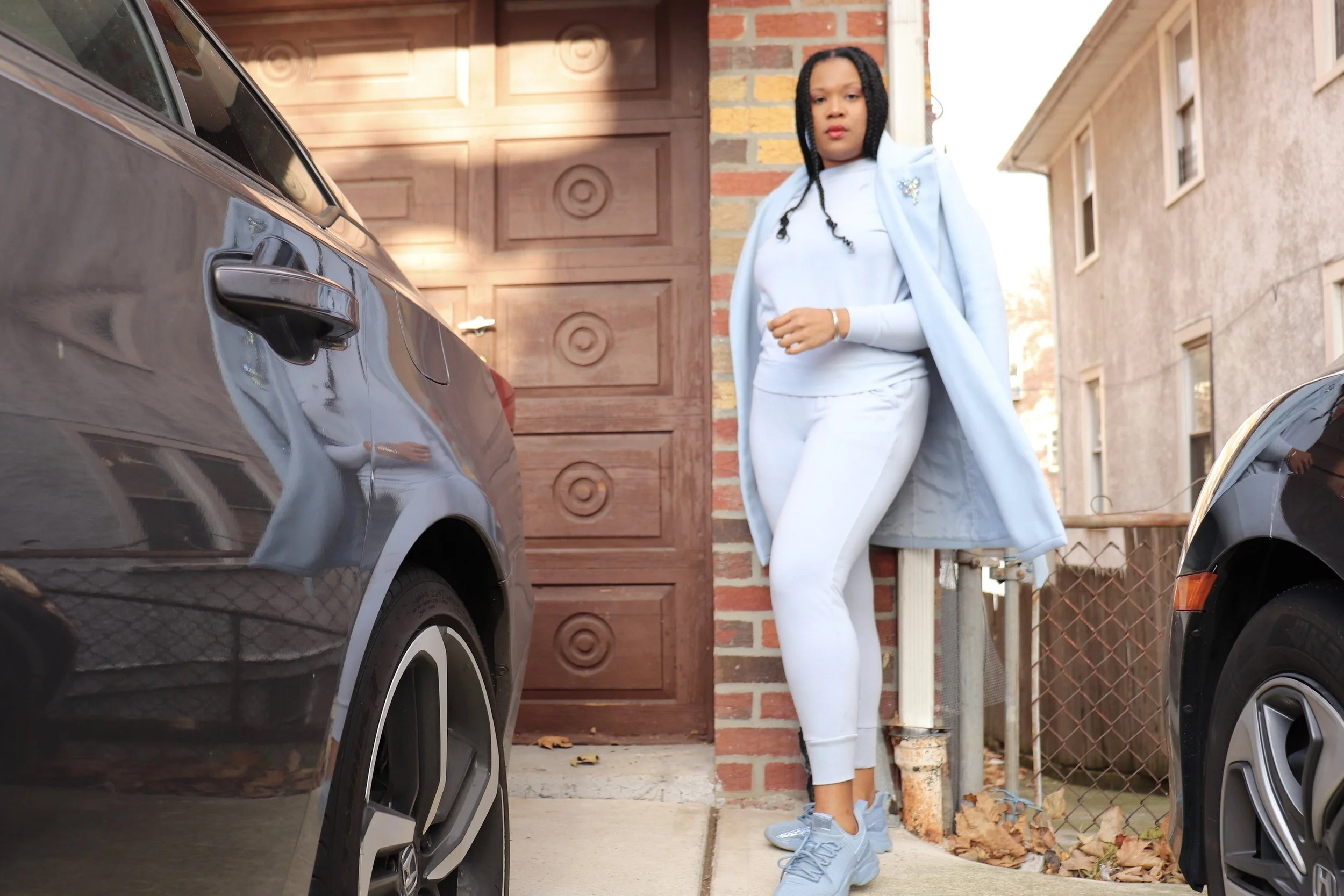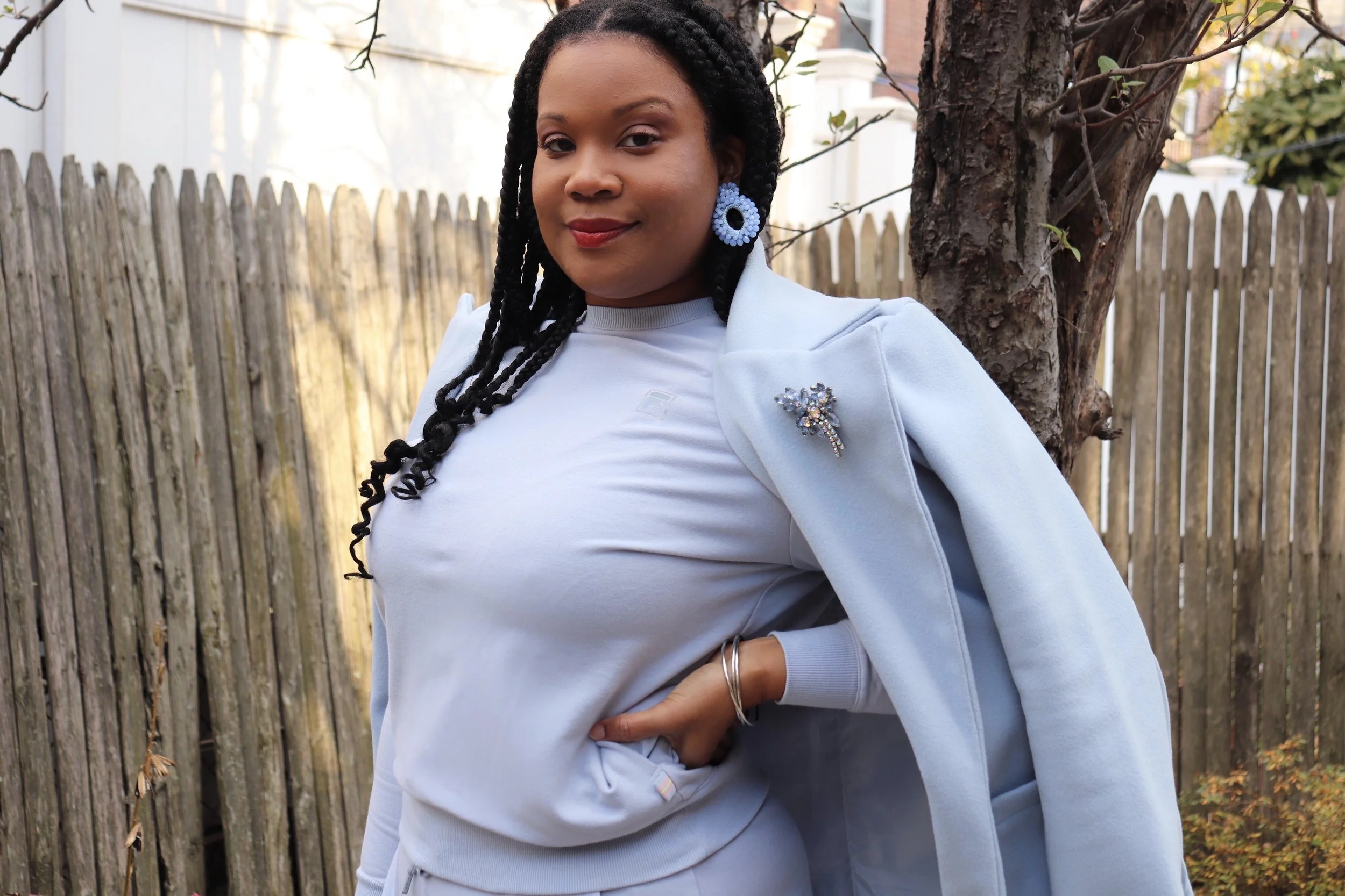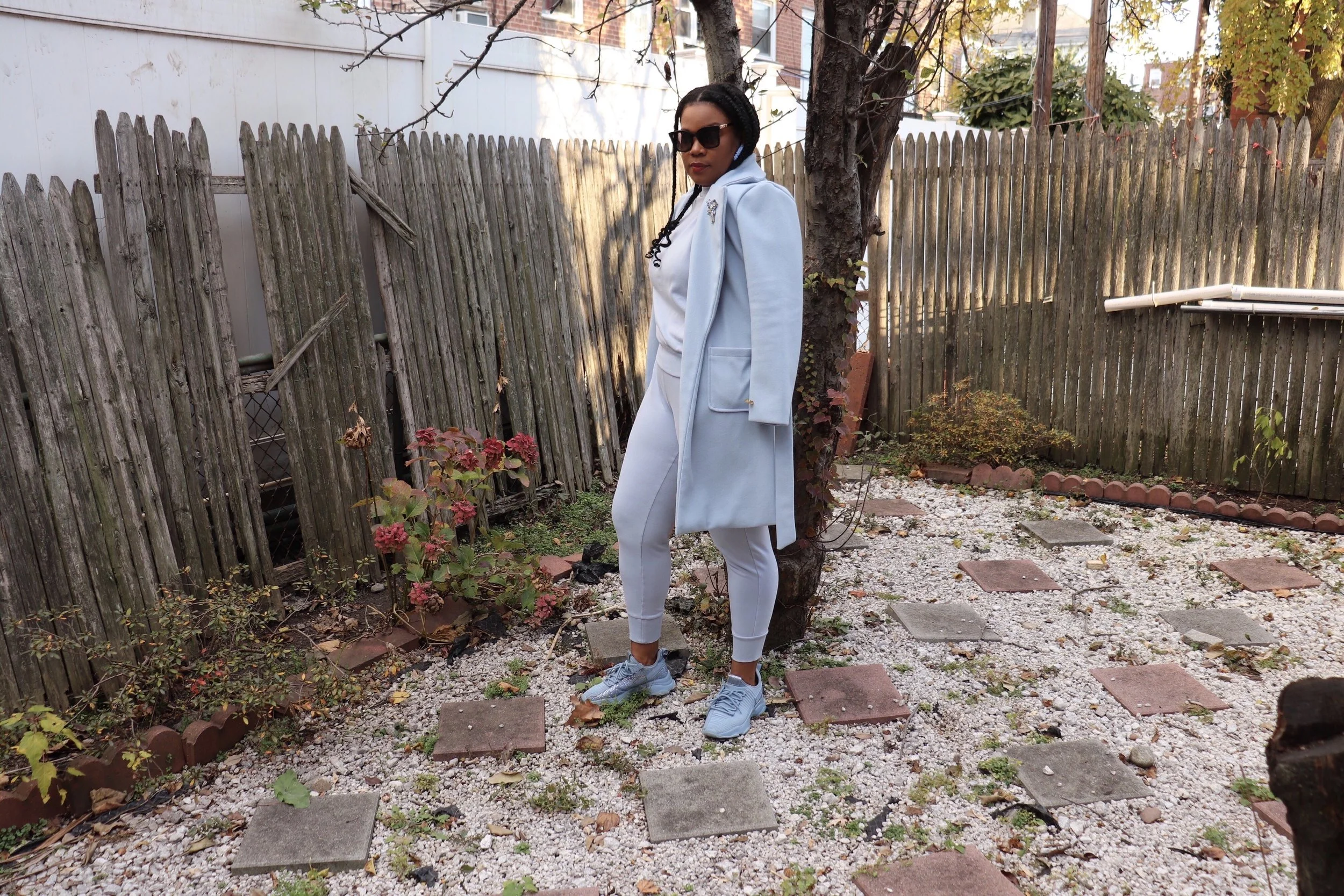 Sweatsuit: Fila; Coat: Amazon; Sneakers: Steve Madden; Earrings: Amazon; Sunglasses: Max Mara
