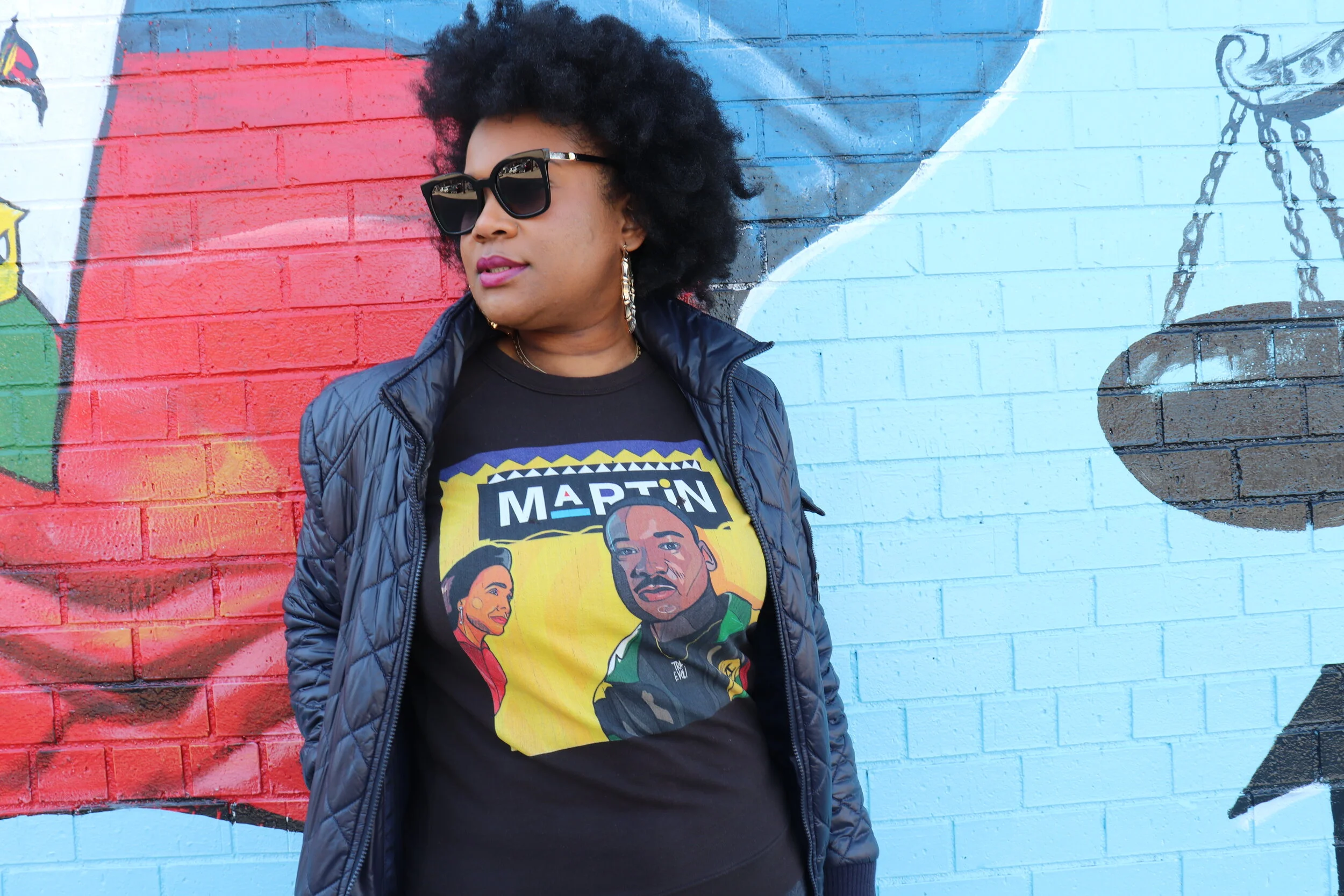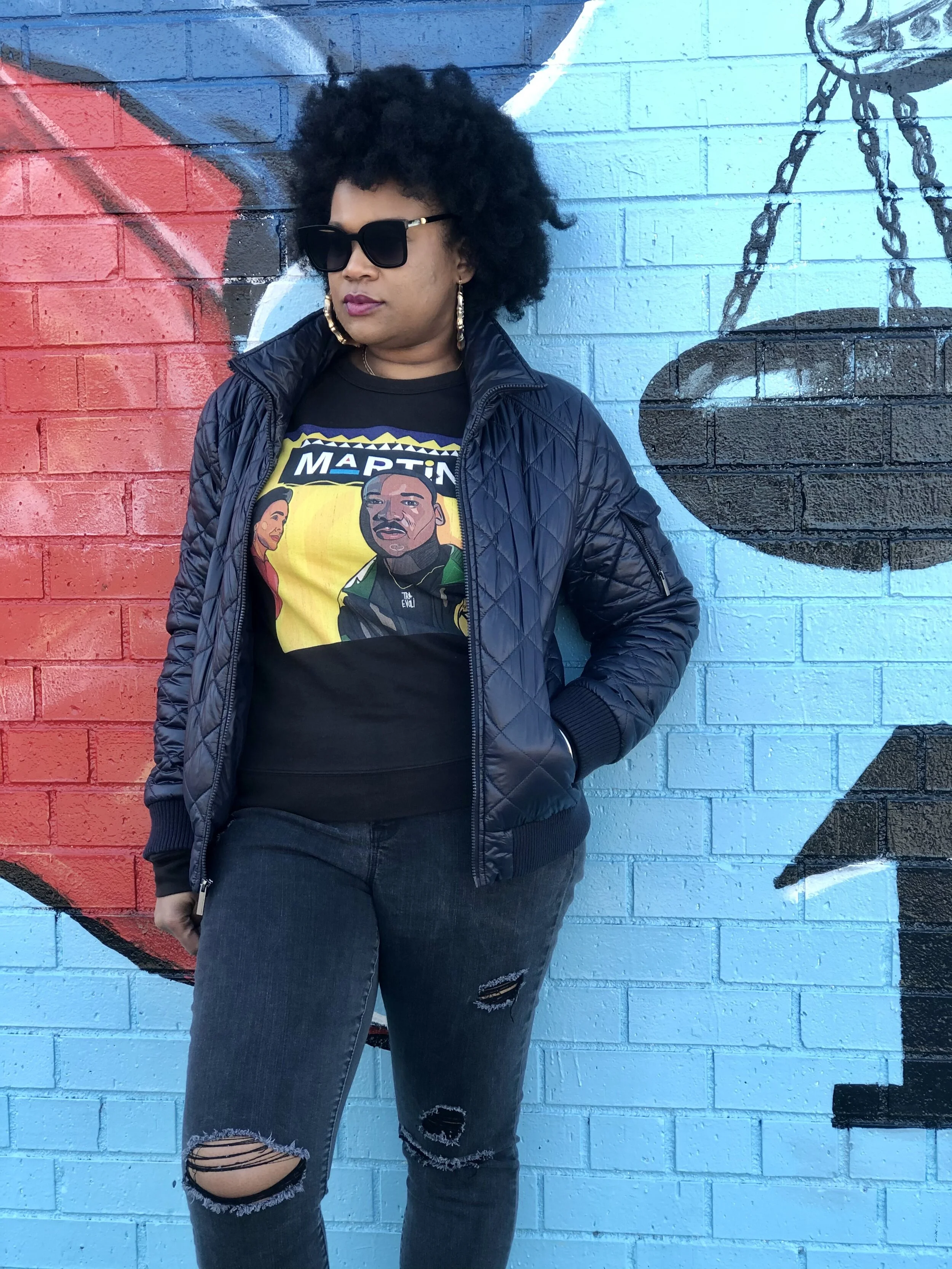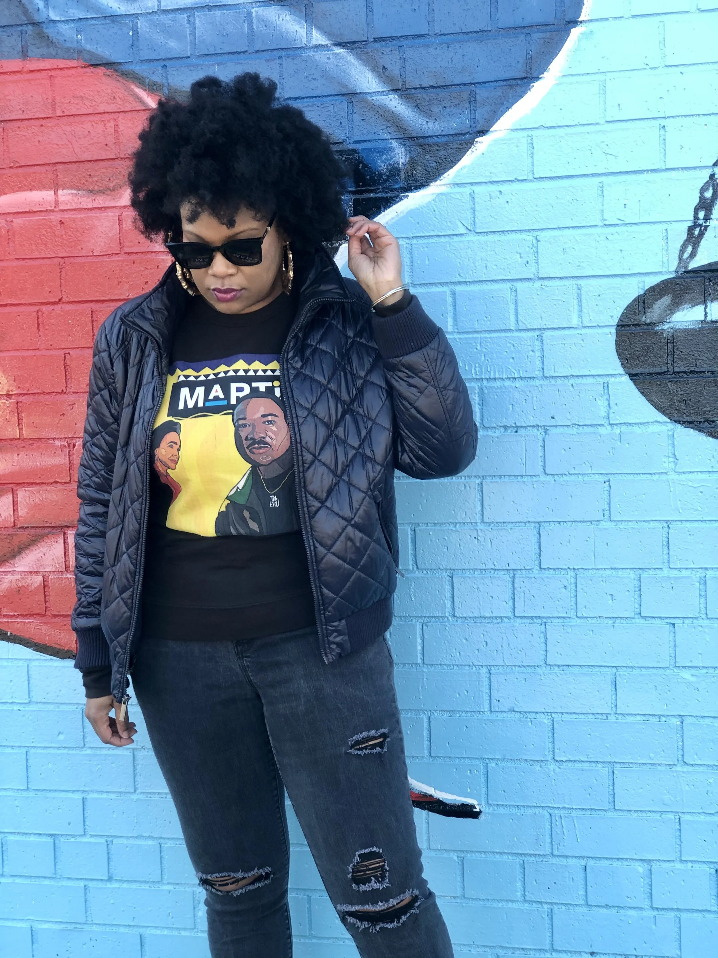Jacket: Nordstrom Rack; sweatshirt: Teepublic; jeans: Old Navy; sneakers: Nike; sunglasses: Max Mara; earrings: Amazon