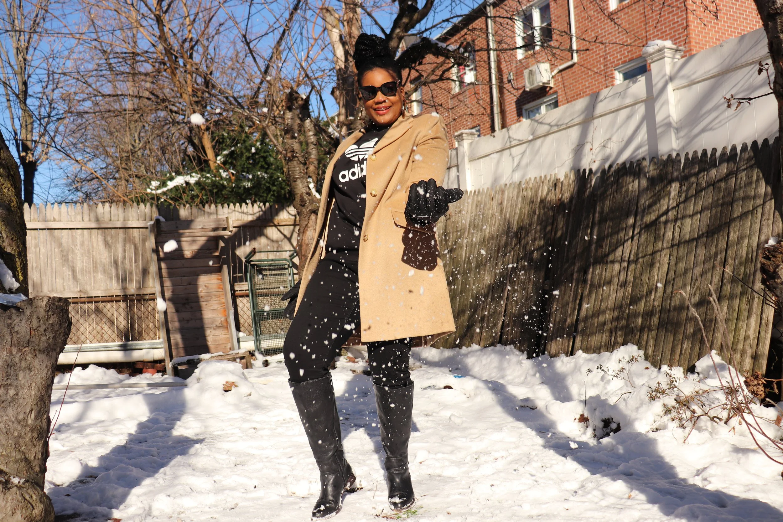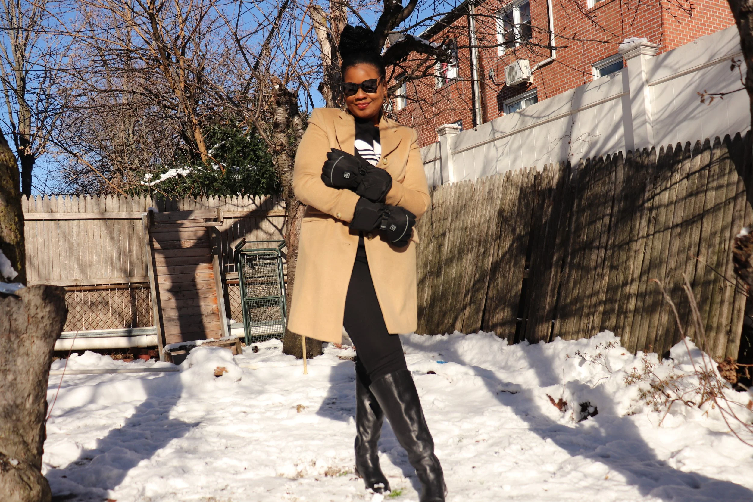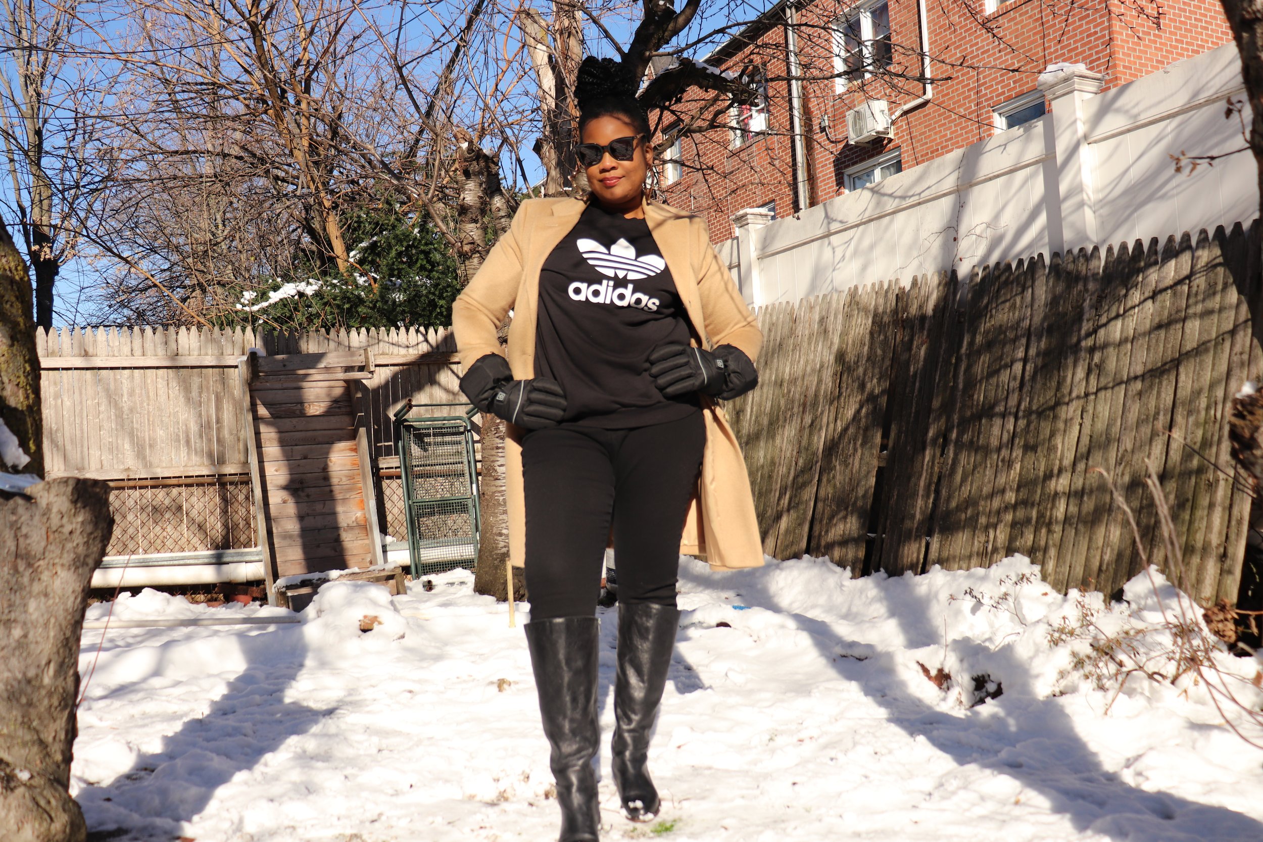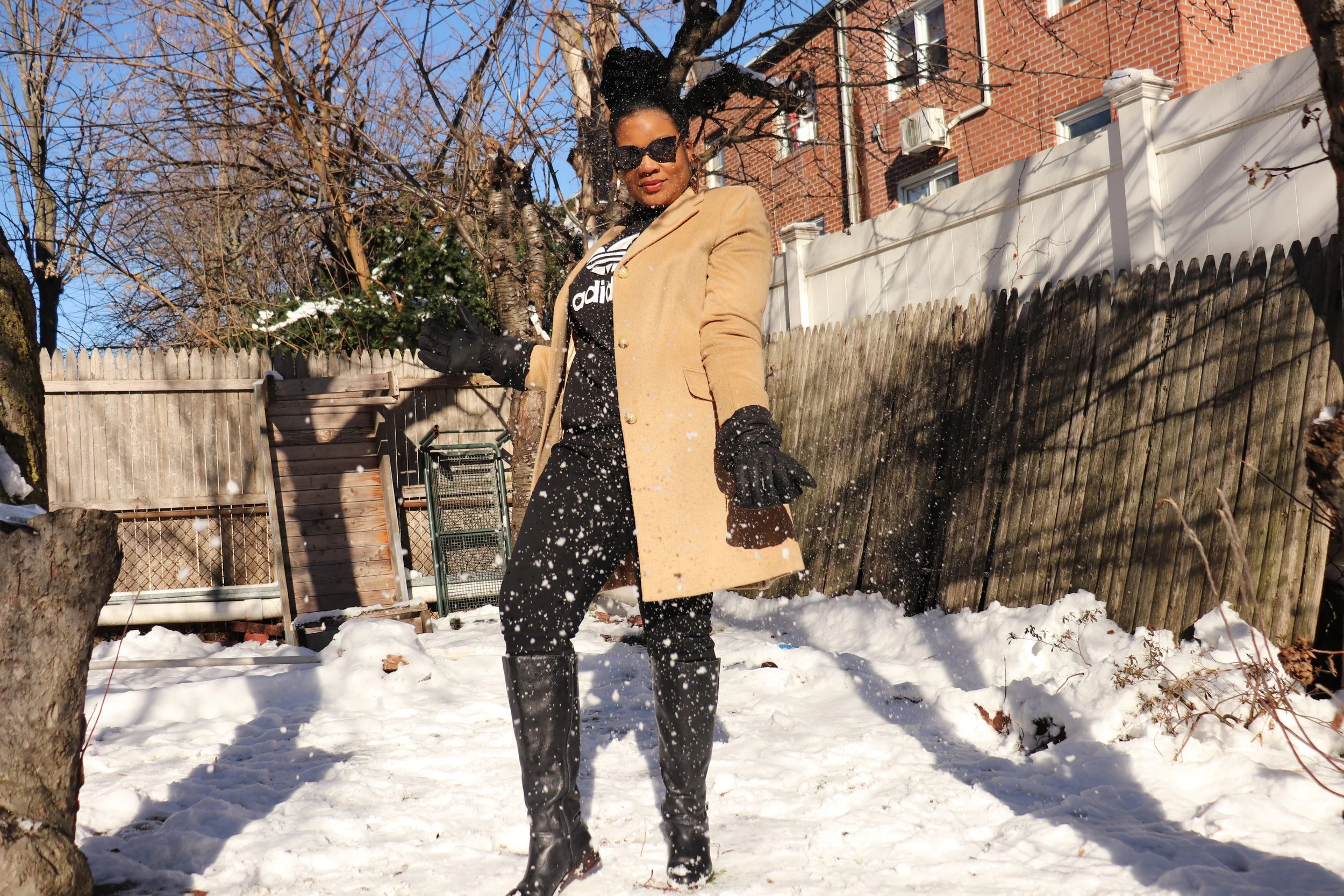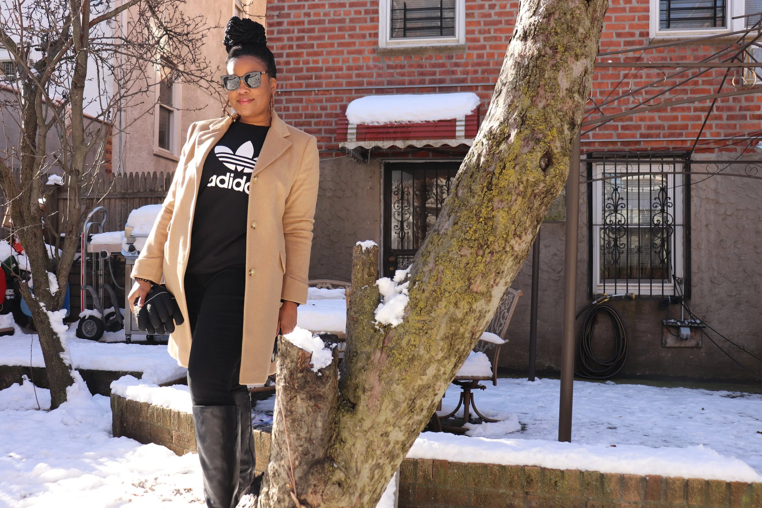 Coat: Ralph Lauren; sweatshirt: Adidas; jeans: Amazon; earrings: Amazon; boots: Hhhhh; sunglasses: Max Mara; gloves: Amazon