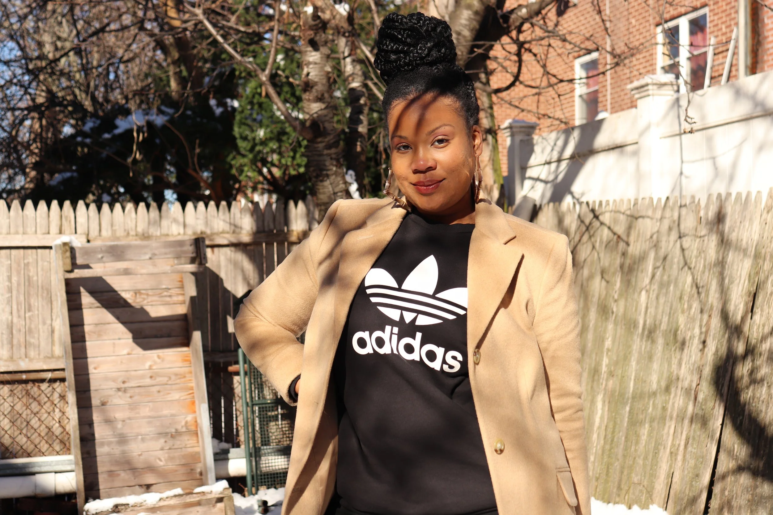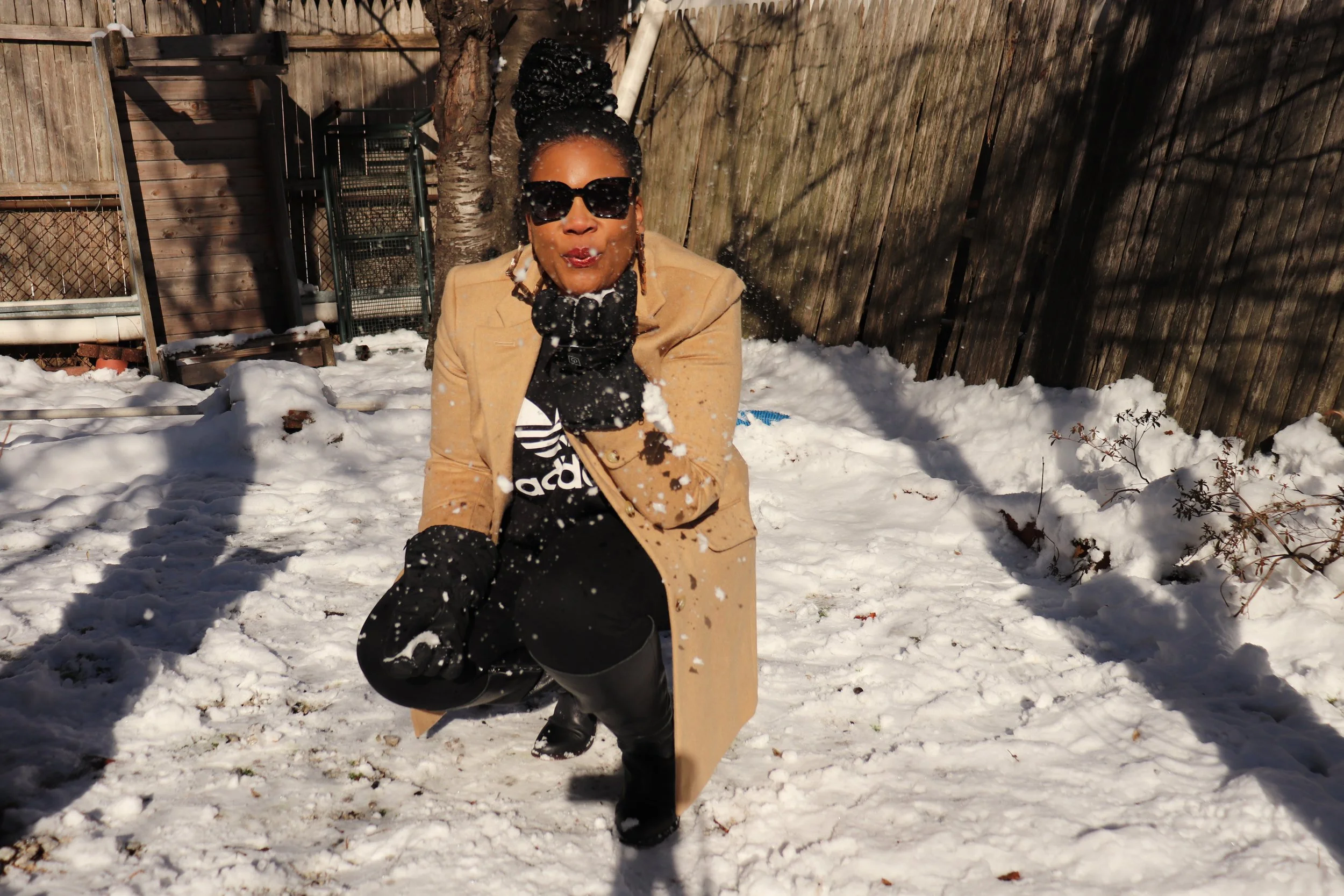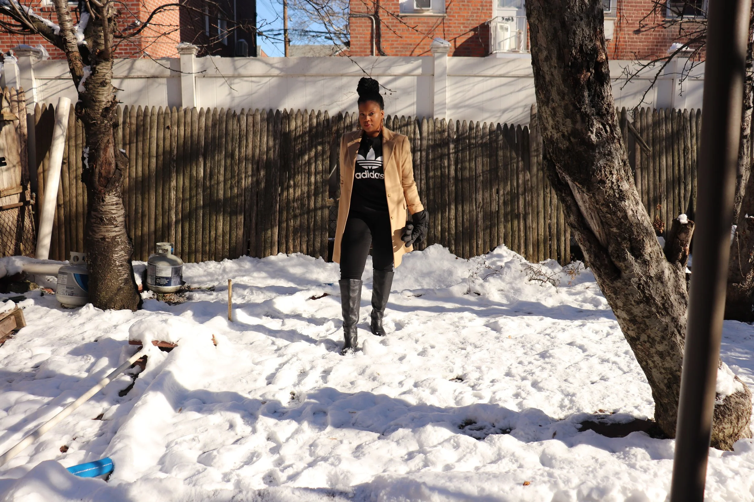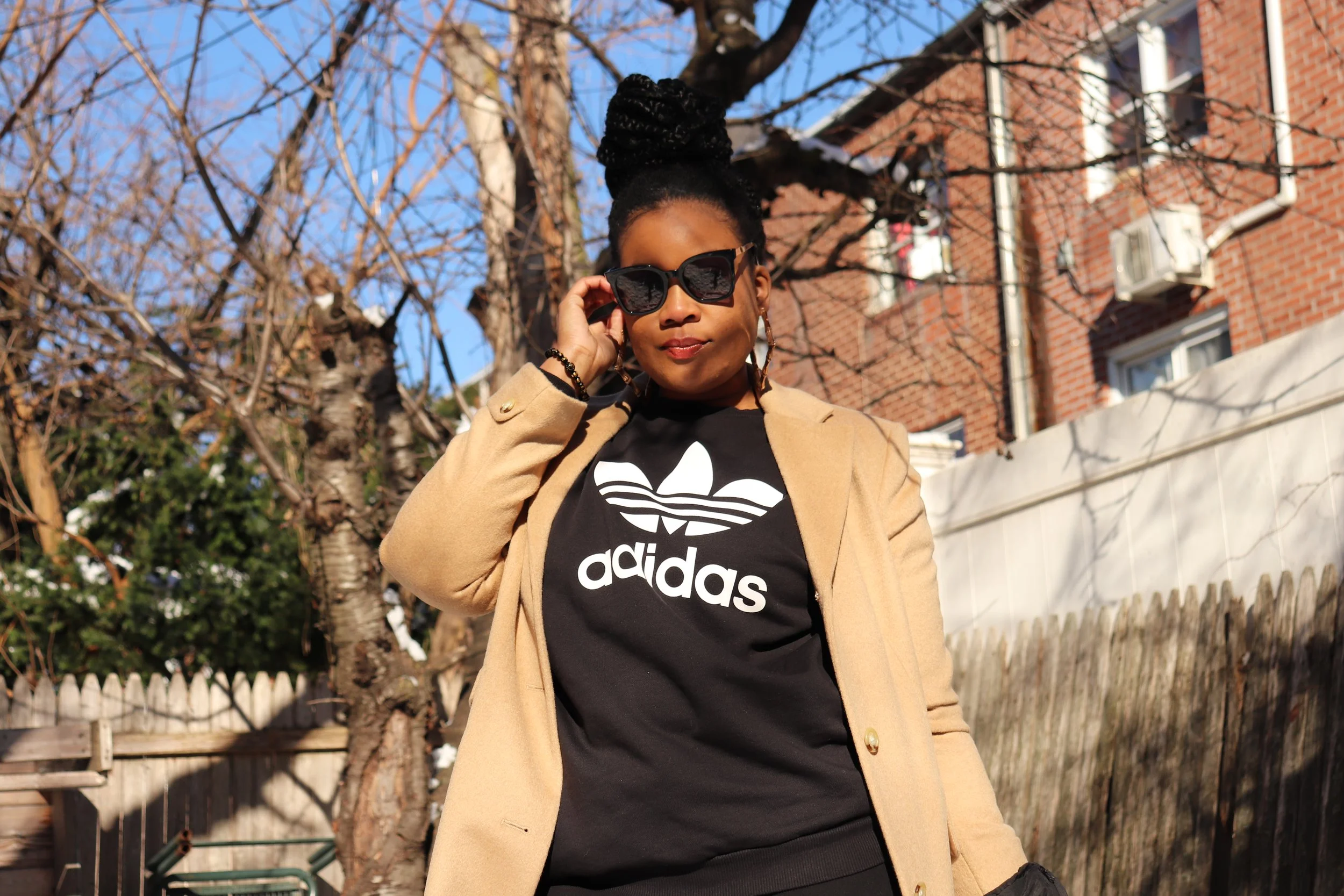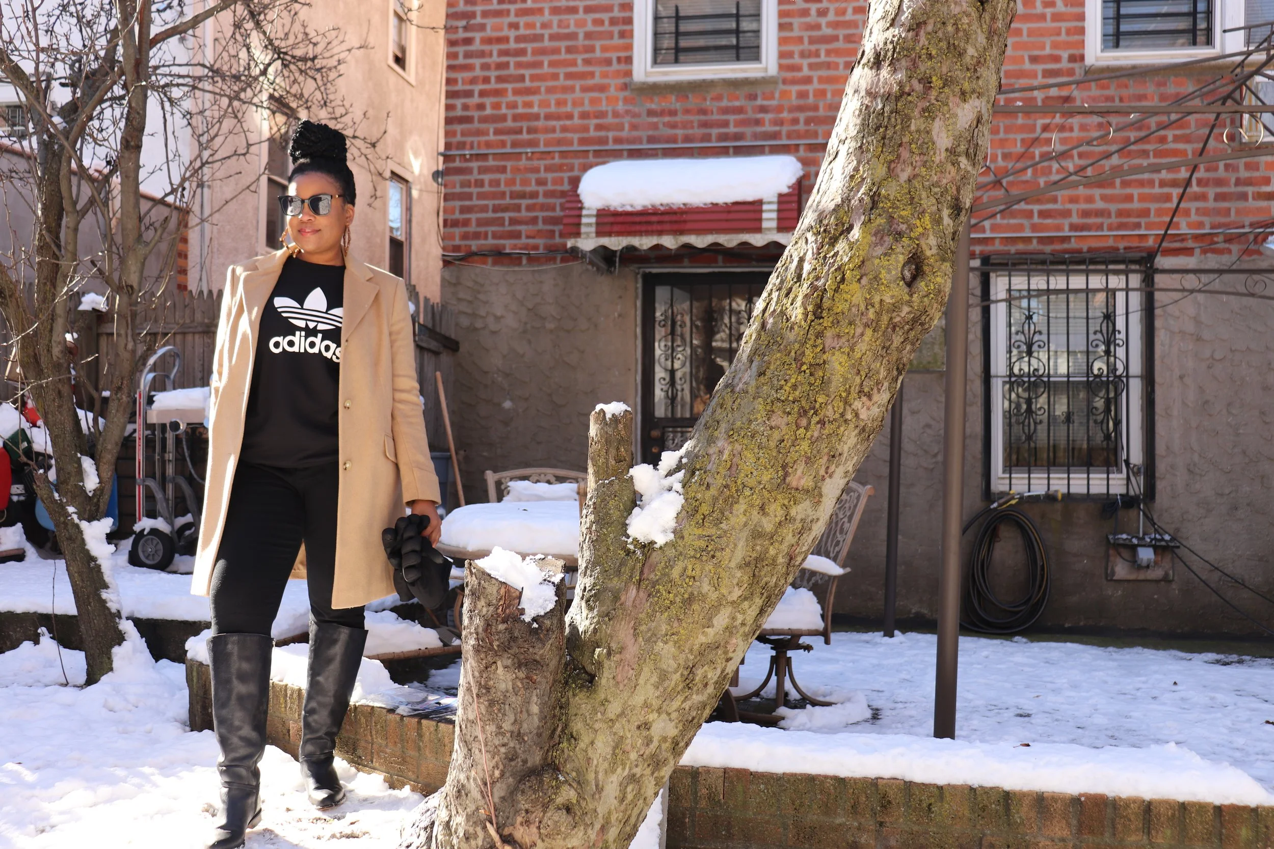 Coat: Ralph Lauren; sweatshirt: Adidas; jeans: Amazon; earrings: Amazon; boots: Hhhhh; sunglasses: Max Mara; gloves: Amazon