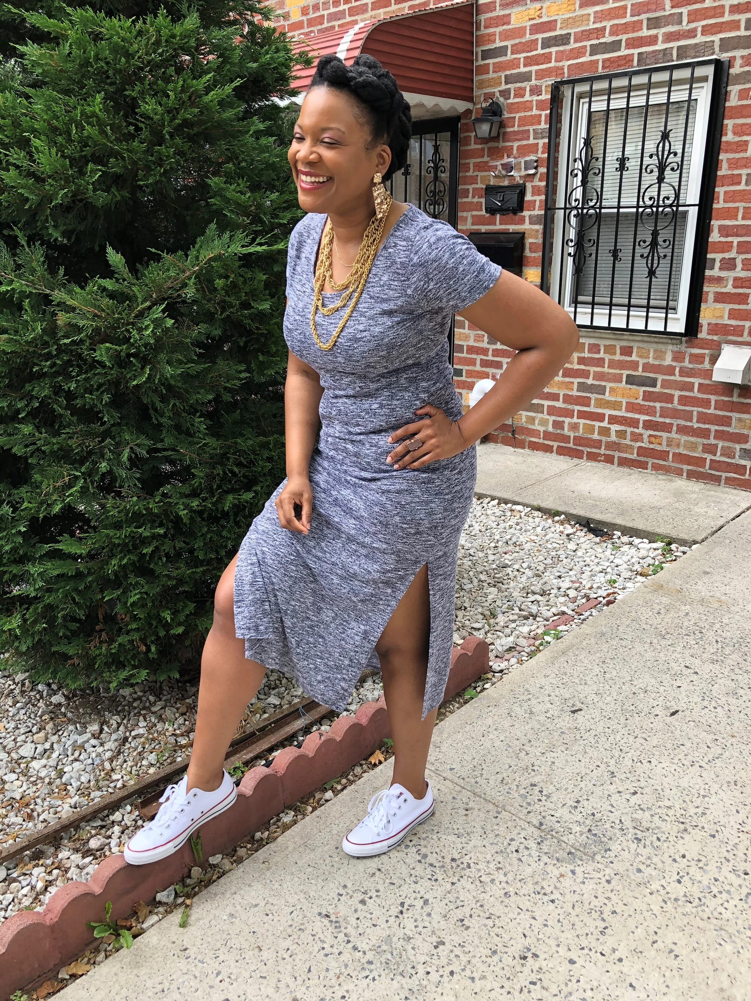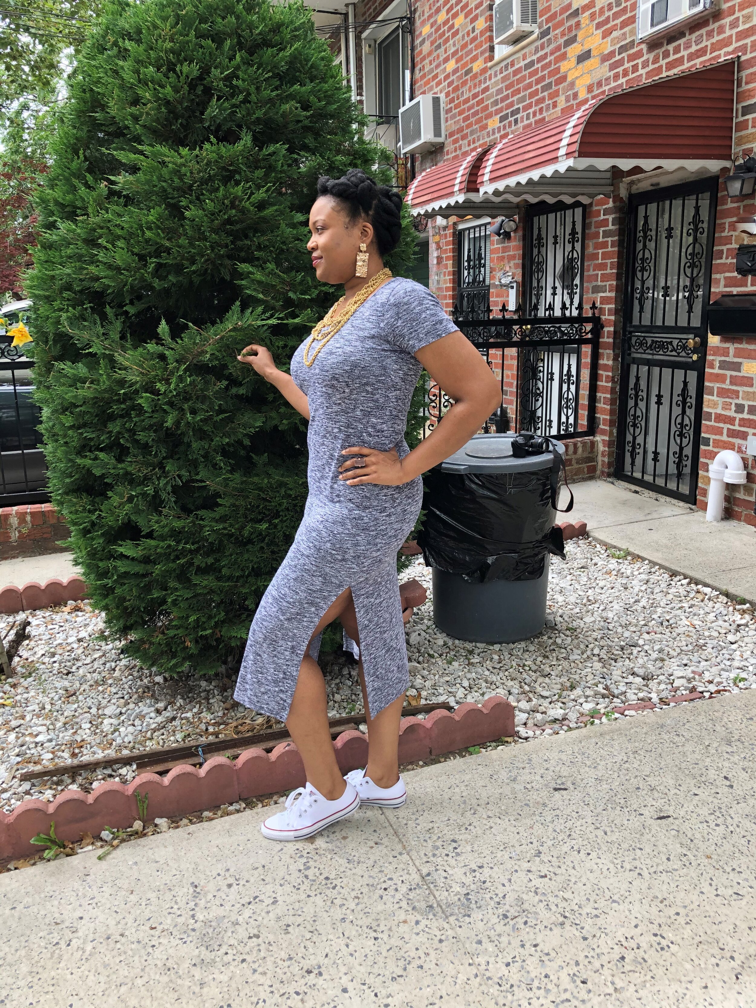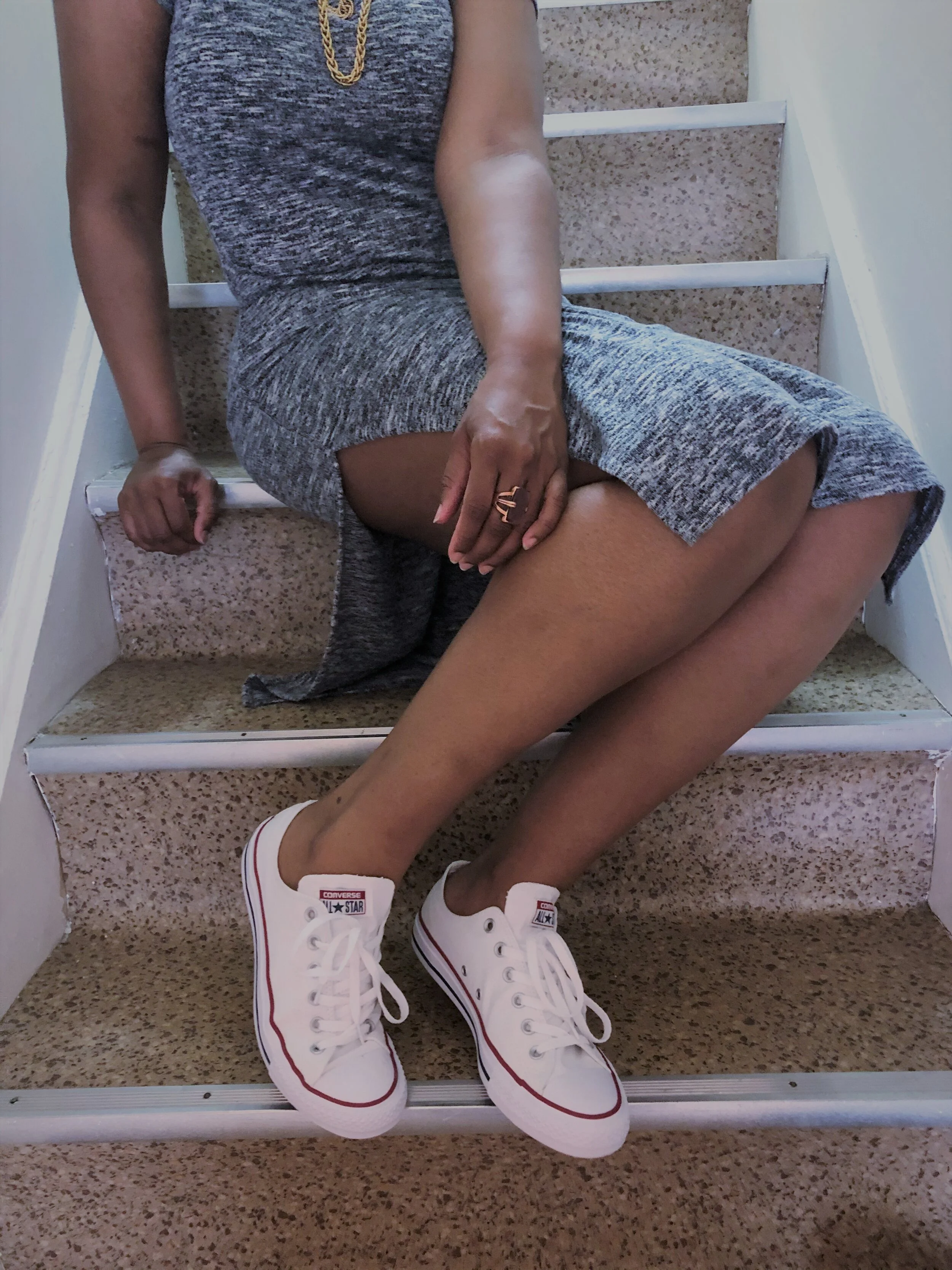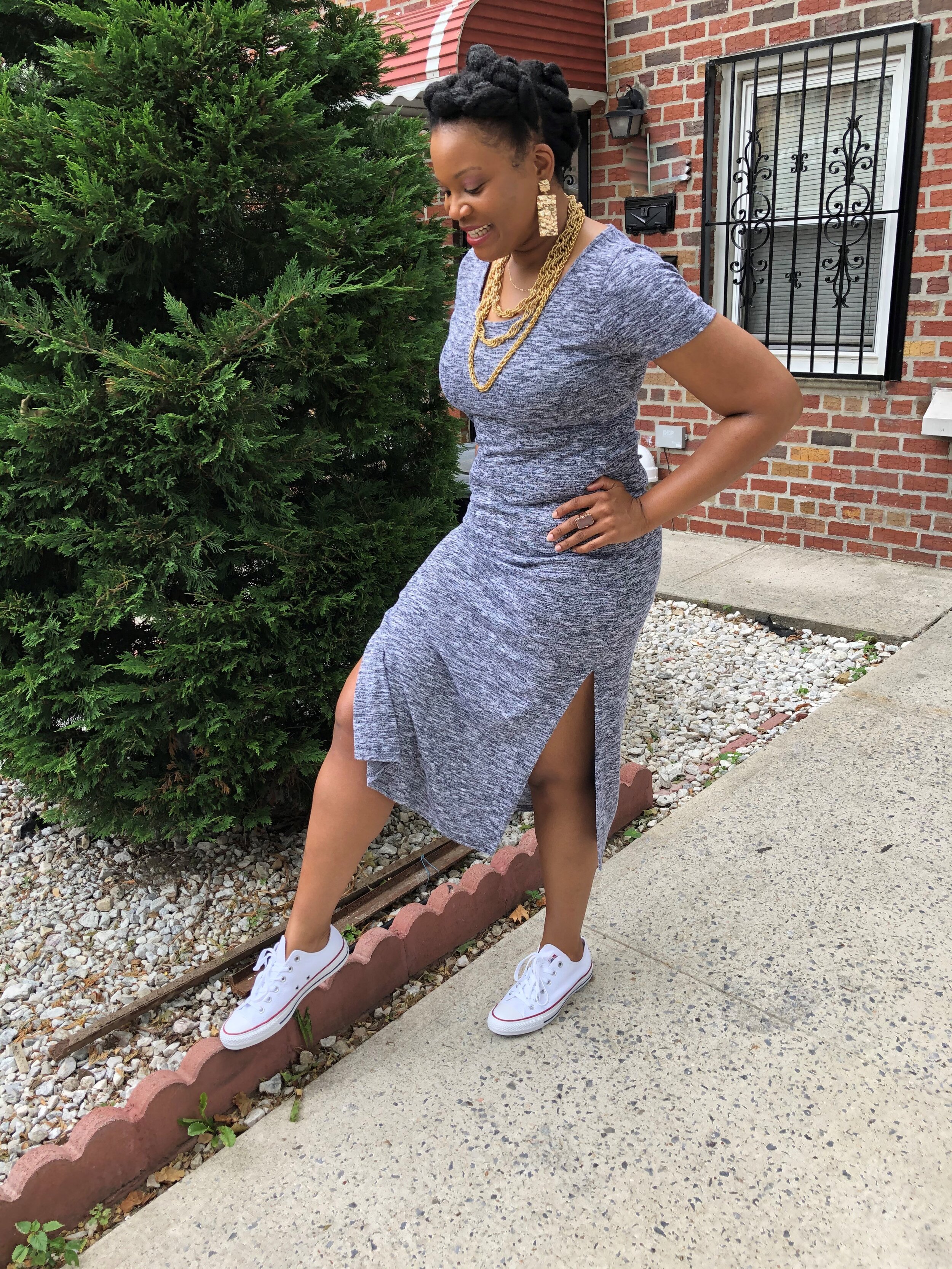 Dress: Nordstrom Rack; sneakers: Converse; chain necklaces: hand-me-downs; earrings: Boohoo