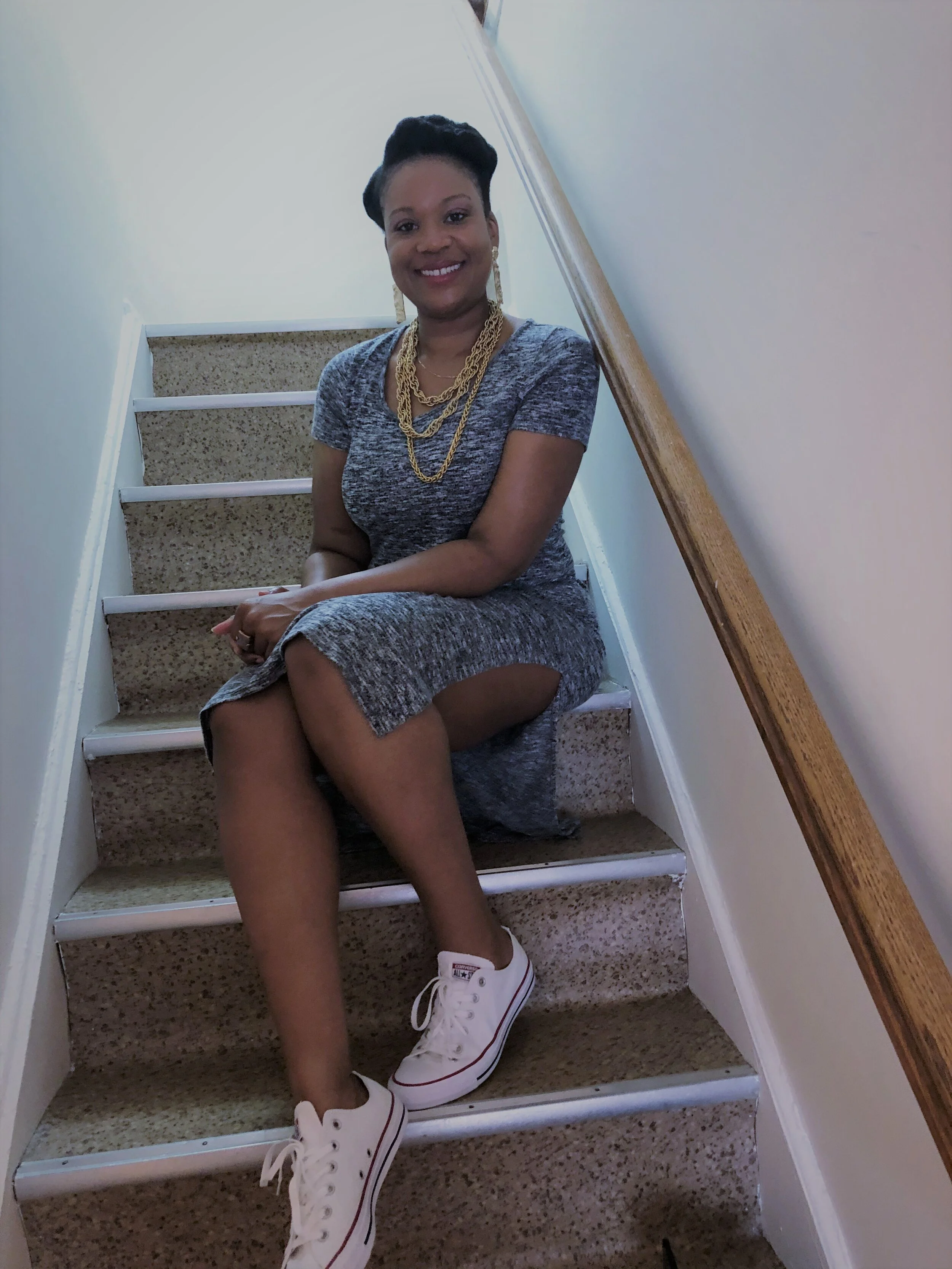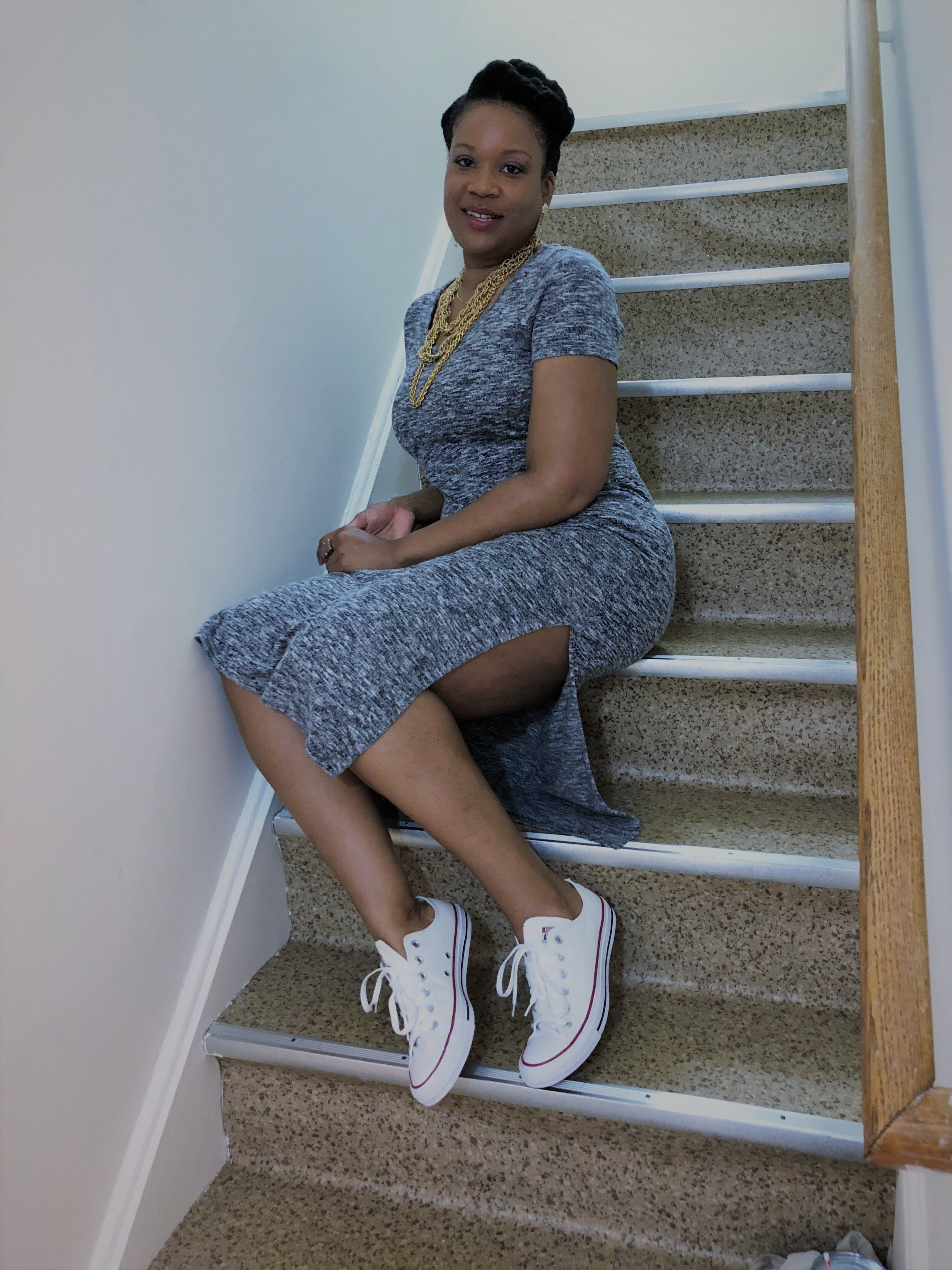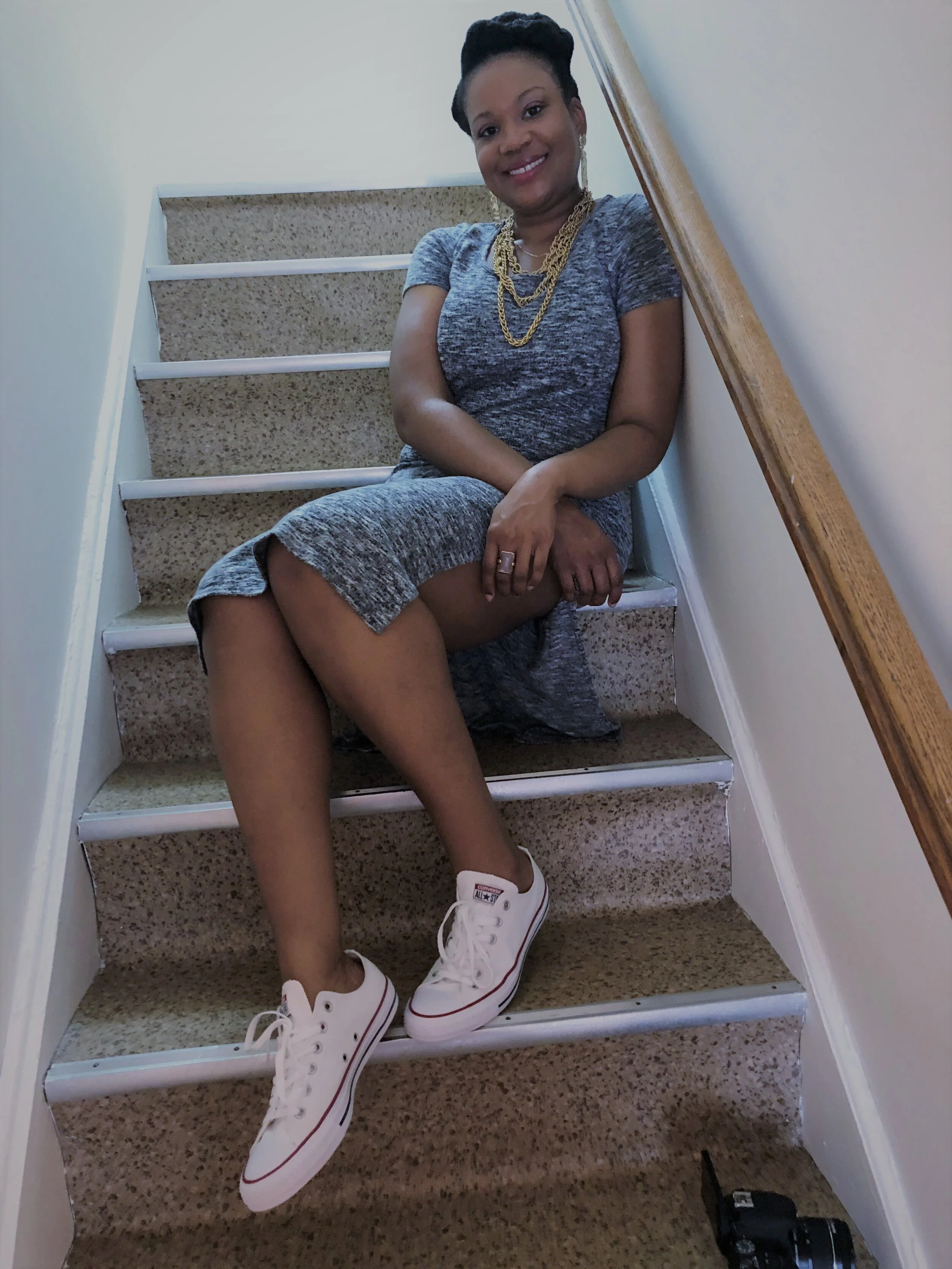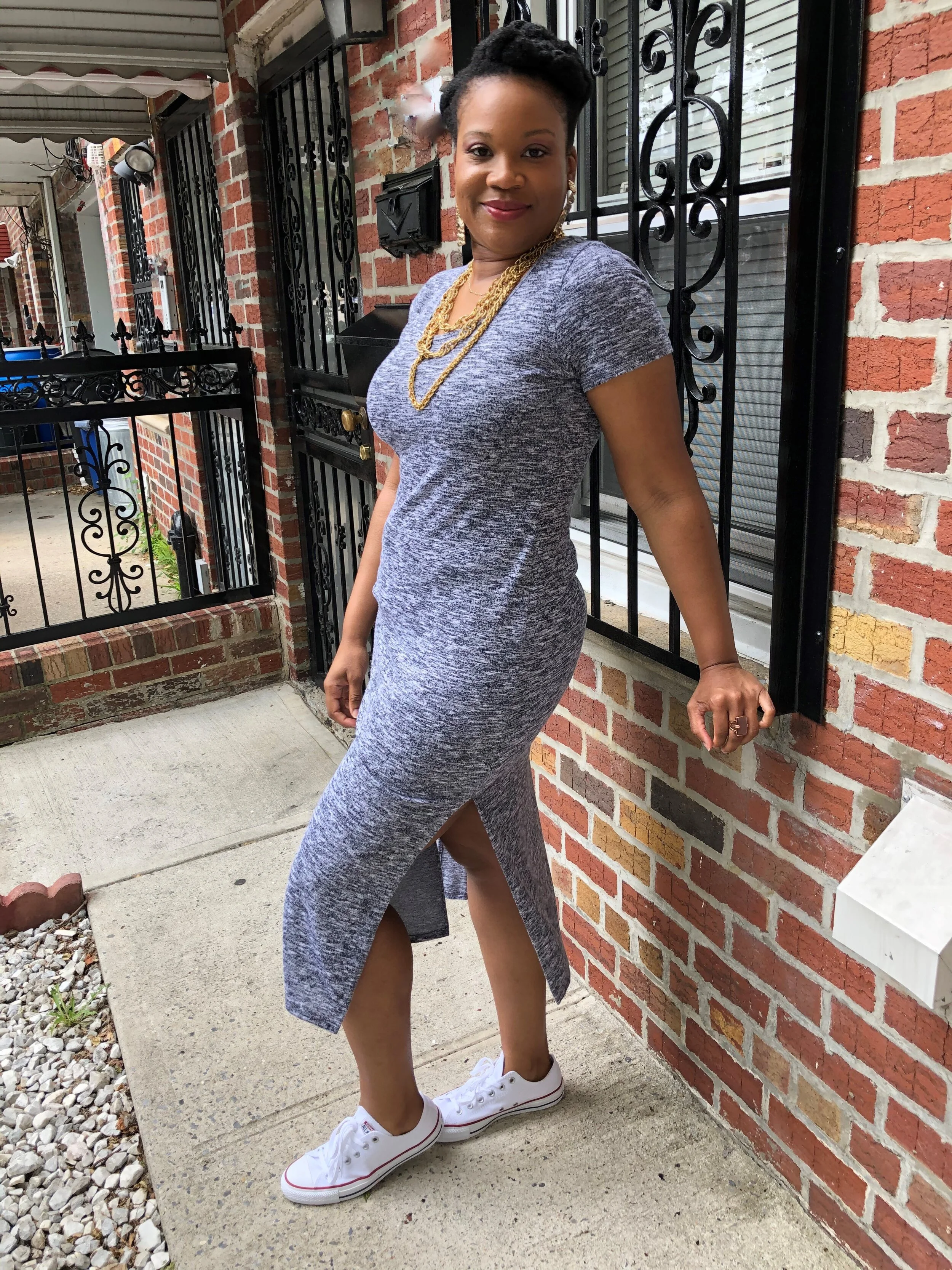 Dress: Nordstrom Rack; sneakers: Converse; chain necklaces: hand-me-downs; earrings: Boohoo